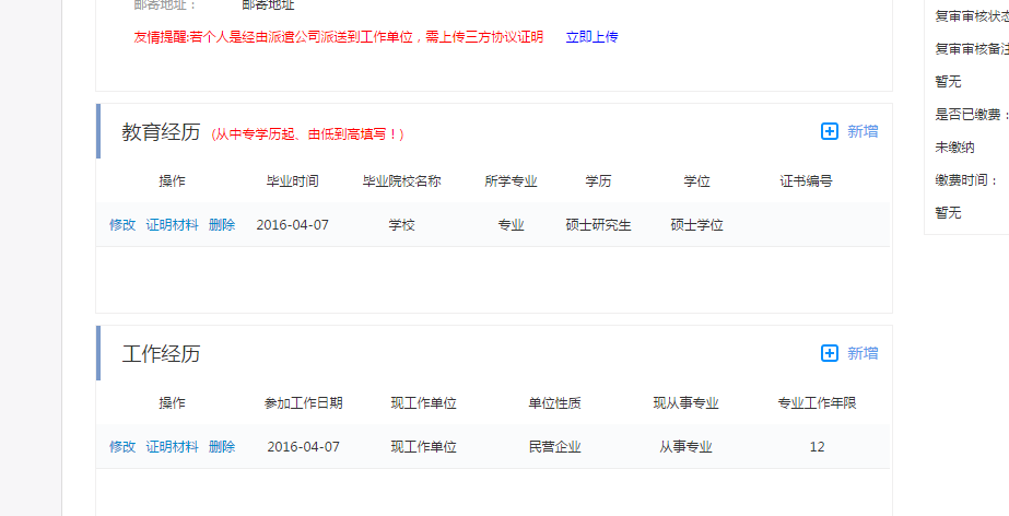 刷新后拖動(dòng)到學(xué)歷信息部分,可見新增的學(xué)歷信息如下顯示,點(diǎn)擊如圖1.1.2.6中的【修改】按鈕可修改選擇的學(xué)歷信息,點(diǎn)擊【刪除】即可刪除當(dāng)前學(xué)歷信息,點(diǎn)擊【證明材料】上傳學(xué)歷證明材料。