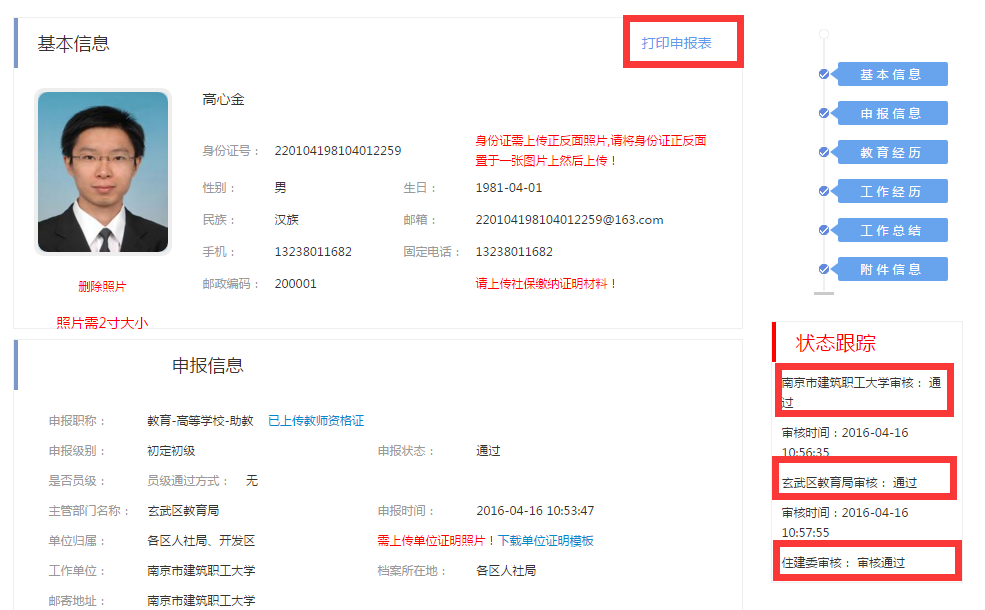 全部填寫完畢后,點(diǎn)擊【保存】按鈕,中高級(jí)職稱申報(bào)基礎(chǔ)信息填寫完成。